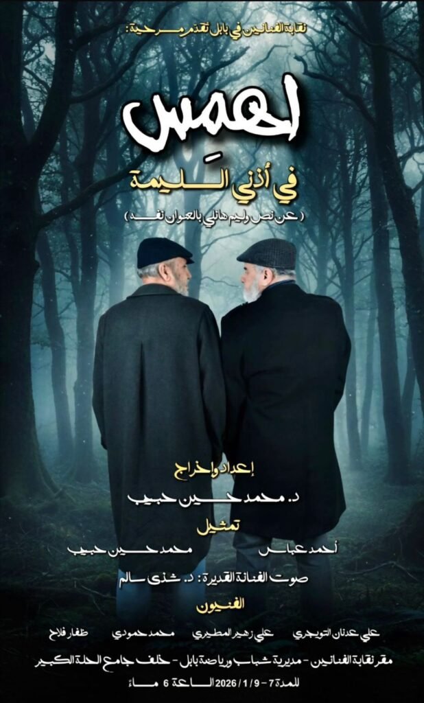 تستعد نقابة الفنانين في محافظة بابل لإطلاق أولى عروضها المسرحية لعام 2026، من خلال العرض المسرحي “أهمس في أذني السليمة”، وذلك خلال الفترة من 7 ولغاية 9 كانون الثاني الجاري.
