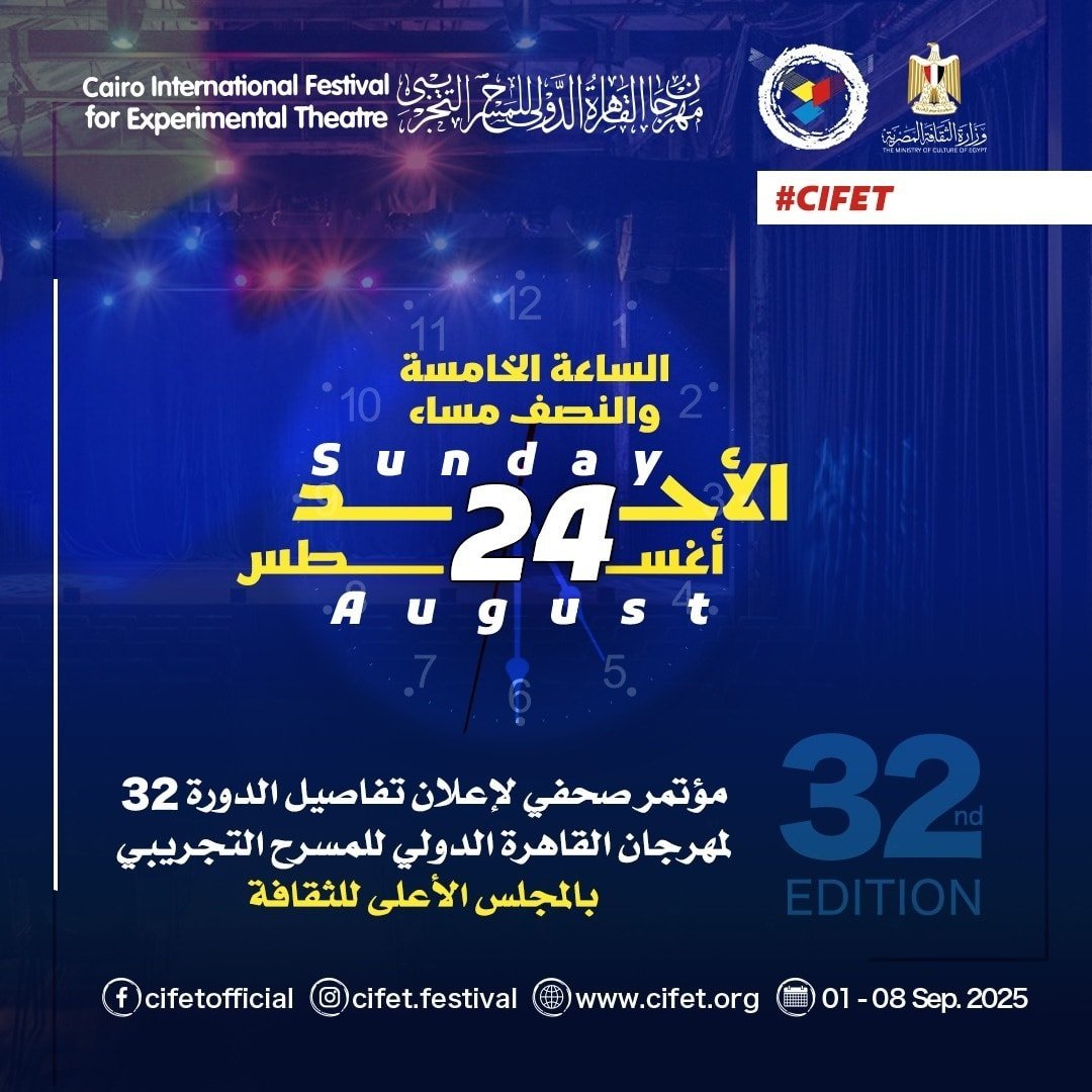 يعقد مهرجان القاهرة الدولي للمسرح التجريبي مؤتمرًا صحفيًا يوم الأحد المقبل 24 أغسطس، في تمام الساعة الخامسة والنصف مساءً، بقاعة المؤتمرات بالمجلس الأعلى للثقافة بدار الأوبرا المصرية، للإعلان عن تفاصيل الدورة الثانية والثلاثين من المهرجان.