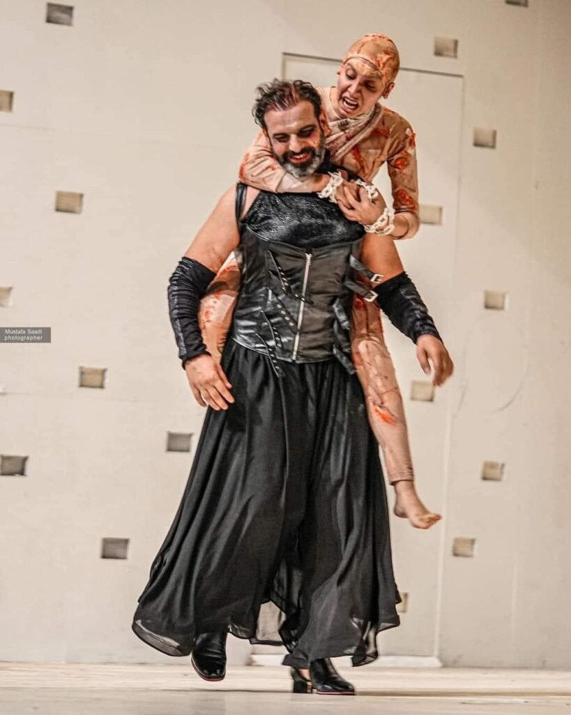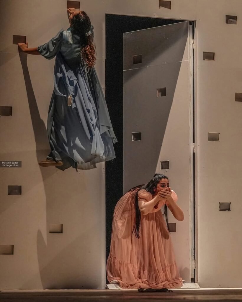 في المقابل، الفنانة (نعمت عبد الحسين) تقدّم أداءً أوبراليًا، يوسّع المجال النفسي والجسدي لتصبح الصوت والجسد متوازيين في إنتاج الدلالة الرمزية، وكأن الصوت الأوبرالي نفسه يشكّل امتدادًا للصراخ المكبوت داخل الذاكرة الجمعية. وصوتها ليس مجرد نغمة بل صرخة الهيمنة الكولونيالية المتمثلة في السلطة الرمزية. كل تصعيد صوتي، كل نفَس مرتفع، يعيد إنتاج العلاقة بين القهر والاختيار، بين الحرية والقيود، ويحوّل الجسد المسرحي إلى لوحة حيّة للهيمنة والتمرد والمقاومة الرمزية.