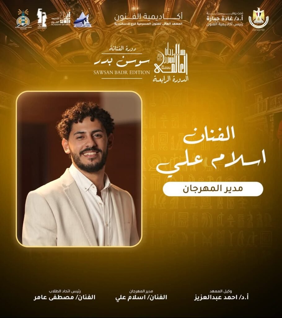 واعرب الفنان إسلام علي مدير المهرجان عن بالغ سعادته لتوليه مهمة ادارة مهرجان المسرح العالمي في دورته الرابعة تحت رعاية الدكتورة غادة جبارة رئيس أكاديمية الفنون ونقيب الممثلين الدكتور اشرف ذكي بالإضافة إلي أن هذه الدورة تحمل اسم كبير وهي الفنانة سوسن بدر والرئيس الشرفي للمهرجان الفنانة ليلى علوي.