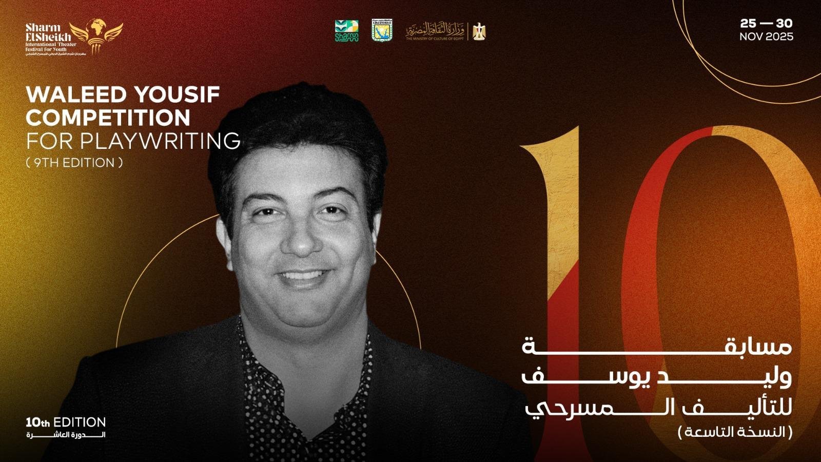 تشجيعًا لحركة الكتابة المسرحية المصرية والعربية، أعلنت إدارة مهرجان شرم الشيخ الدولي للمسرح الشبابي، برئاسة المخرج مازن الغرباوي، عن تفاصيل النسخة التاسعة من مسابقة التأليف المسرحي التي تحمل اسم الكاتب المسرحي وليد يوسف، ضمن فعاليات الدورة العاشرة للمهرجان (دورة النجمة الكبيرة إلهام شاهين)، والمقرر إقامتها في الفترة من 25 إلى 30 نوفمبر المقبل بمدينة شرم الشيخ، وذلك عبر استمارة رسمية تم طرحها للراغبين في المشاركة.
