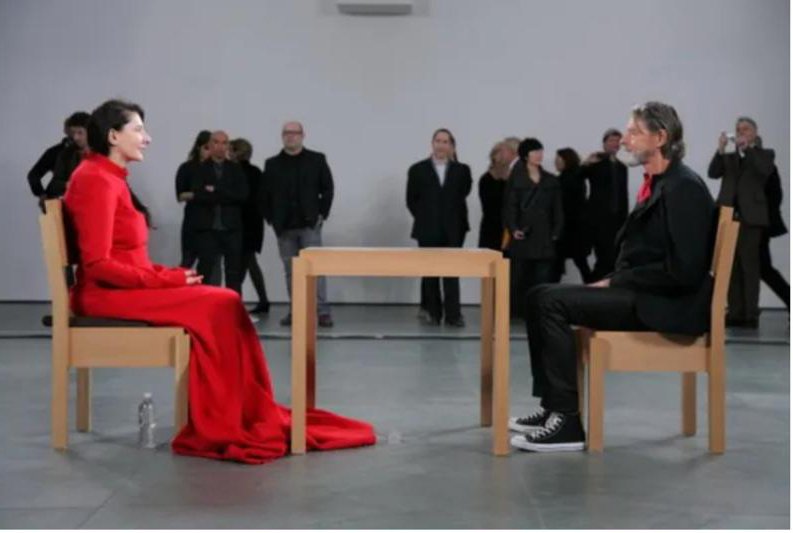 للوهلة الأولى، يبدو هذا الأداء نوعاً من الأداء طويل الأمد، وهو نوع أدبي طورته بنفسها، مما يجعل الوقت والجسد ملموسين. مع ذلك، كان هذا الأداء مختلفاً. لم يكن مبدأ تجربة الزمن سوى جزء من العرض، وربما لم يكن أكثر من سطح أدائي. ورغم أن “مارينا” جلست مقابل كل زائر على طاولة، إلا أنها لم تكن الوحيدة.
