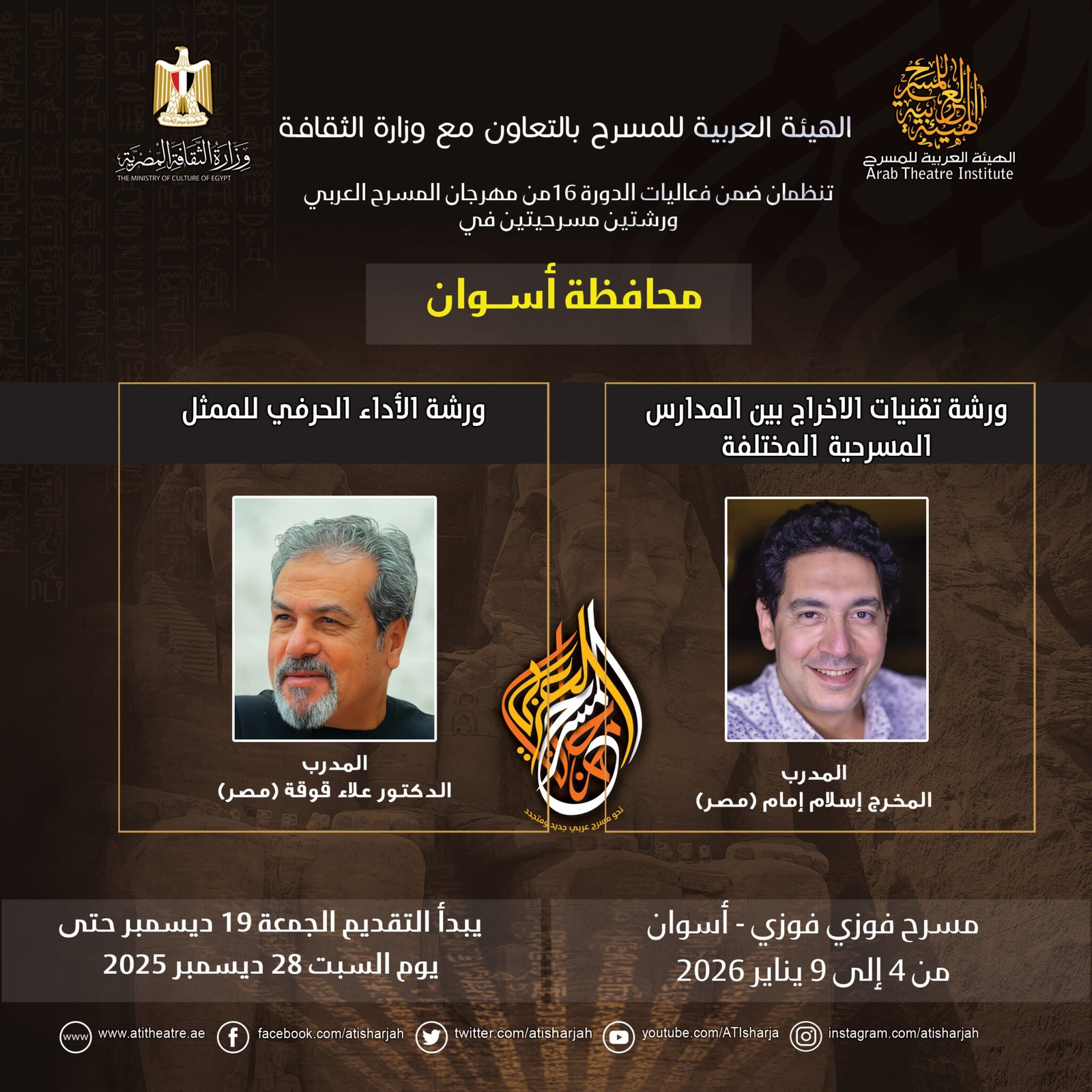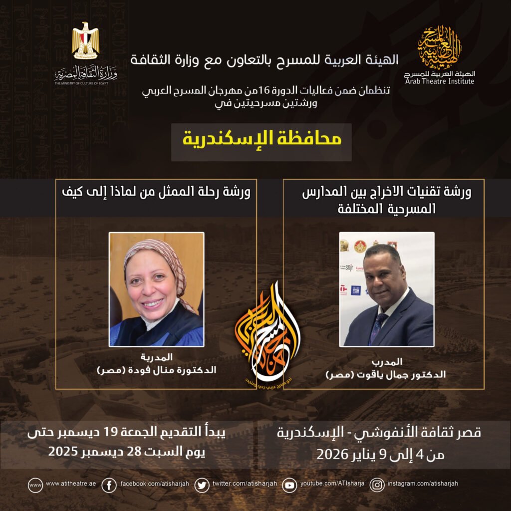 تعلن الهيئة العربية للمسرح بالتعاون مع وزارة الثقافة المصرية عن فتح باب التسجيل في سلسلة ورشات تكوينية متخصصة، وذلك ضمن فعاليات الدورة 16 من مهرجان المسرح العربي، الذي يُعقد في الفترة من 10 إلى 16 يناير 2026 بالقاهرة.